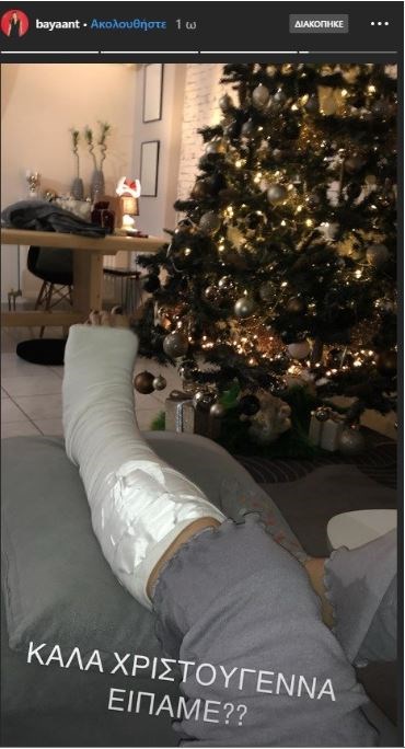 Η Μπάγια Αντωνοπούλου, ανέβασε στο instastory της μια φωτογραφία όπου δείχνει το πόδι της στον γύψο με φόντο το χριστουγεννιάτικο δέντρο στο σαλόνι της.