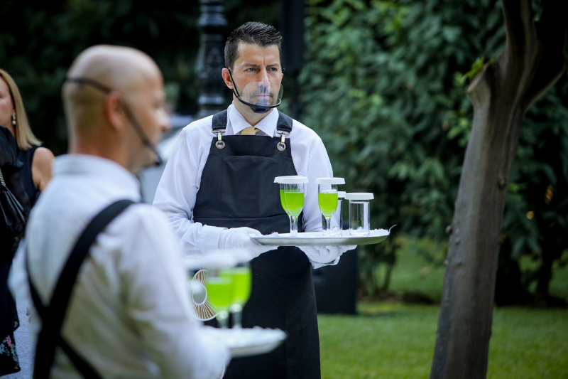 Με προστατευτικές μάσκες οι σερβιτόροι -Φωτογραφία: ΕUROKINISSI/ΣΩΤΗΡΗΣ ΔΗΜΗΤΡΟΠΟΥΛΟΣ