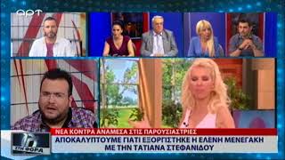 Η Τατιάνα Στεφανίδου τόνισε πως αυτό ήταν απαράδεκτο καθώς έχουμε θρηνήσει θύματα από τέτοια περιστατικά! Όταν όμως η Ελένη Μενεγάκη, την πήρα τηλέφωνο και την ενημέρωσαν πως την κράζει η Στεφανίδου, τρελάθηκε! Έβριζε, ούρλιαζε ενώ προσπάθησε να έρθει σε επαφή με την Τατιάνα Στεφανίδου, η οποία όμως ήταν εξαφανισμένη!