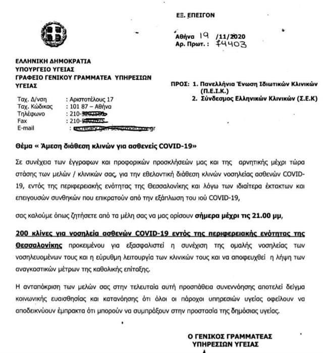 Το υπουργείο Υγείας απέστειλε τελεσίγραφο το βράδυ της Πέμπτη στις ιδιωτικές κλινικές και συγκεκριμένα μέχρι τις 21:00 το βράδυ ώστε να παραδώσουν άμεσα 200 κλίνες covid-19. Σε διαφορετική περίπτωση, το υπουργείο θα προχωρήσει σε επίταξη.