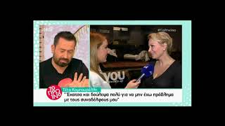 "Εγώ δεν μίλησα για τα νούμερα που έκανε στην εκπομπή, είπα ότι είναι σωστή επαγγελματίας! Δεν ξέρω τι έγινε τώρα με αυτό που μου λες, αλλά επειδή το αναφέρεις, πρέπει να ρωτήσω, δεν μπορώ να πω", χωρίς να μπορεί να θυμηθεί τι είχε διαμειφθεί μεταξύ του πρώην συζύγου της και της συνεργάτιδάς τους στο Mega. Δείτε όλα όσα ειπώθηκαν στο βίντεο που ακολουθεί: