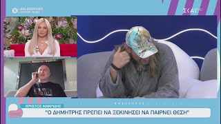 «Ο φίλος μου ο Δημήτρης, είχε πει… “τέρμα το ψέμα και η υποκρισία”. Υπάρχει αυτό το πράγμα να το βλέπετε πουθενά; Εγώ όσο ήμουν μέσα 77 ημέρες, συνεχώς για την Άννα Μαρία έλεγε και του είχα πει: “Δημήτρη, είσαι ερωτευμένος με την Άννα Μαρία” και μου έλεγε: “Όχι”. Εγώ μάλωσα με την Άννα Μαρία για τον Δημήτρη. Δεν μάλωσα για μένα. Φάνηκε και από τις ψηφοφορίες. Εγώ μια φορά την ψήφισα την Άννα Μαρία, δεν είχα λόγο να μαλώσω μαζί της».