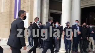 Αποδοκιμασίες ακούστηκαν και κατά την είσοδο στην Μητρόπολη του Κυριάκου Βελόπουλου και της Λίνας Μενδώνη.