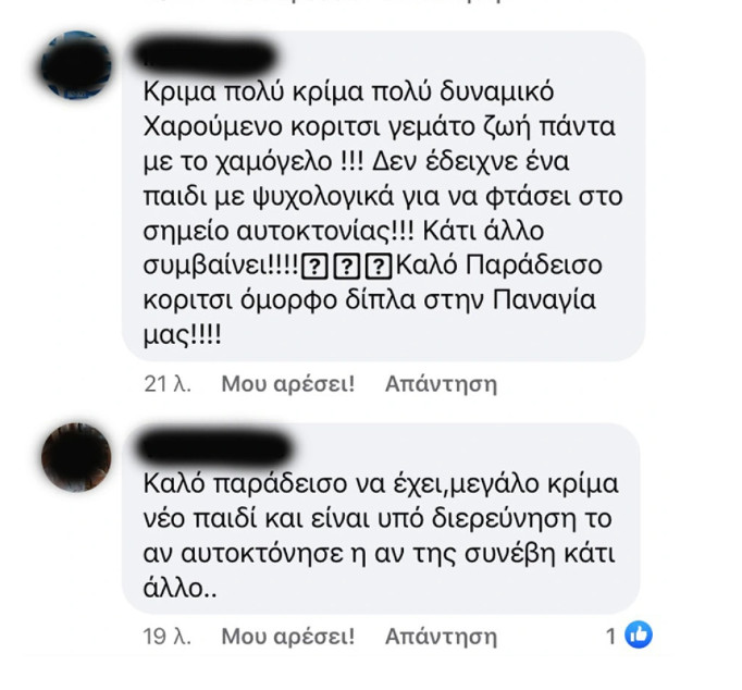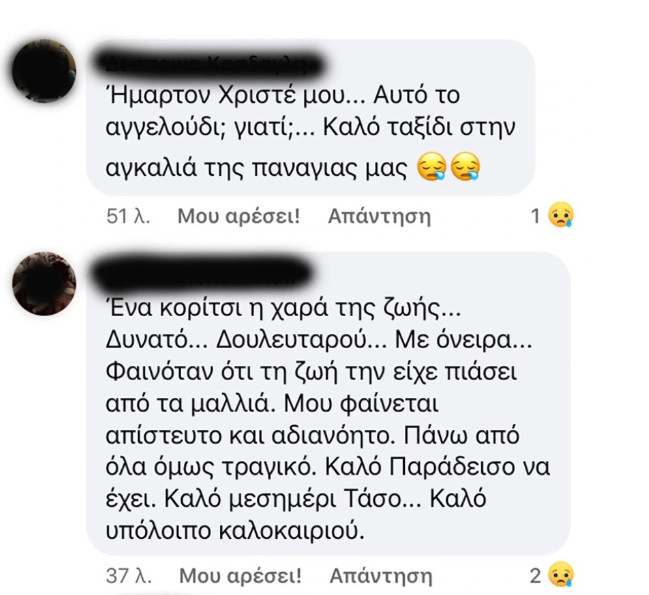 Συντετριμμένοι είναι και οι φίλοι της κοπέλας στο Facebook. Μάλιστα, ορισμένοι αναφέρουν στα σχόλιά τους ότι κάποιος πρέπει να «κρύβεται» πίσω από την αυτοκτονία της άτυχης κοπέλας.