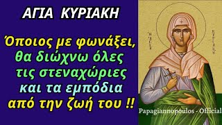 Την Αγία Κυριακή επικαλούνται χιλιάδες πιστοί κάθε φορά για να γιατρέψει κάθε ψυχικό πόνο και την κατάθλιψη, πάντα βέβαια χάριτι Αγίου Πνεύματος. Παναγία Τριάς Ελέησον ημάς, Κύριε Ιησού Χριστέ, Ελέησον με, Υπεραγία Θεοτόκε Σώσον ημάς.