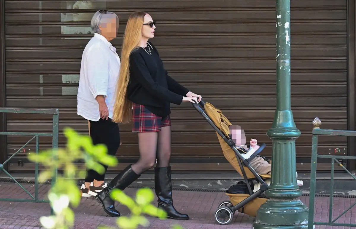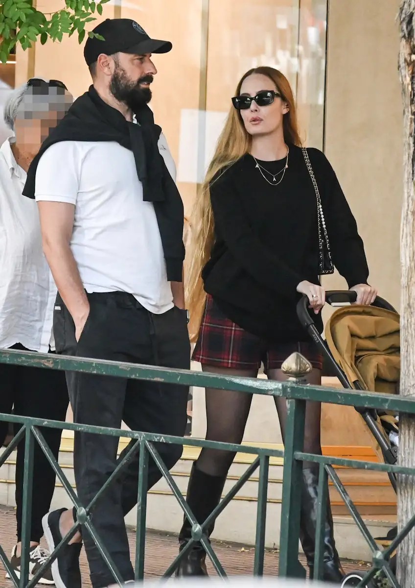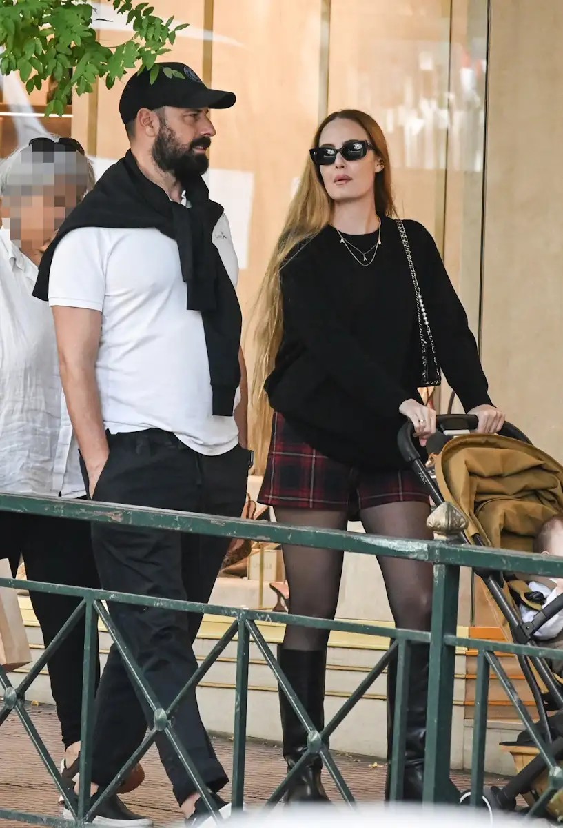 Η Αντωνία Καλλιμούκου έκανε τη βόλτα της στη Βουκουρεστίου, κρατώντας το καρότσι με το μωράκι της, ενώ ο σύζυγός της βρισκόταν στο πλευρό της.