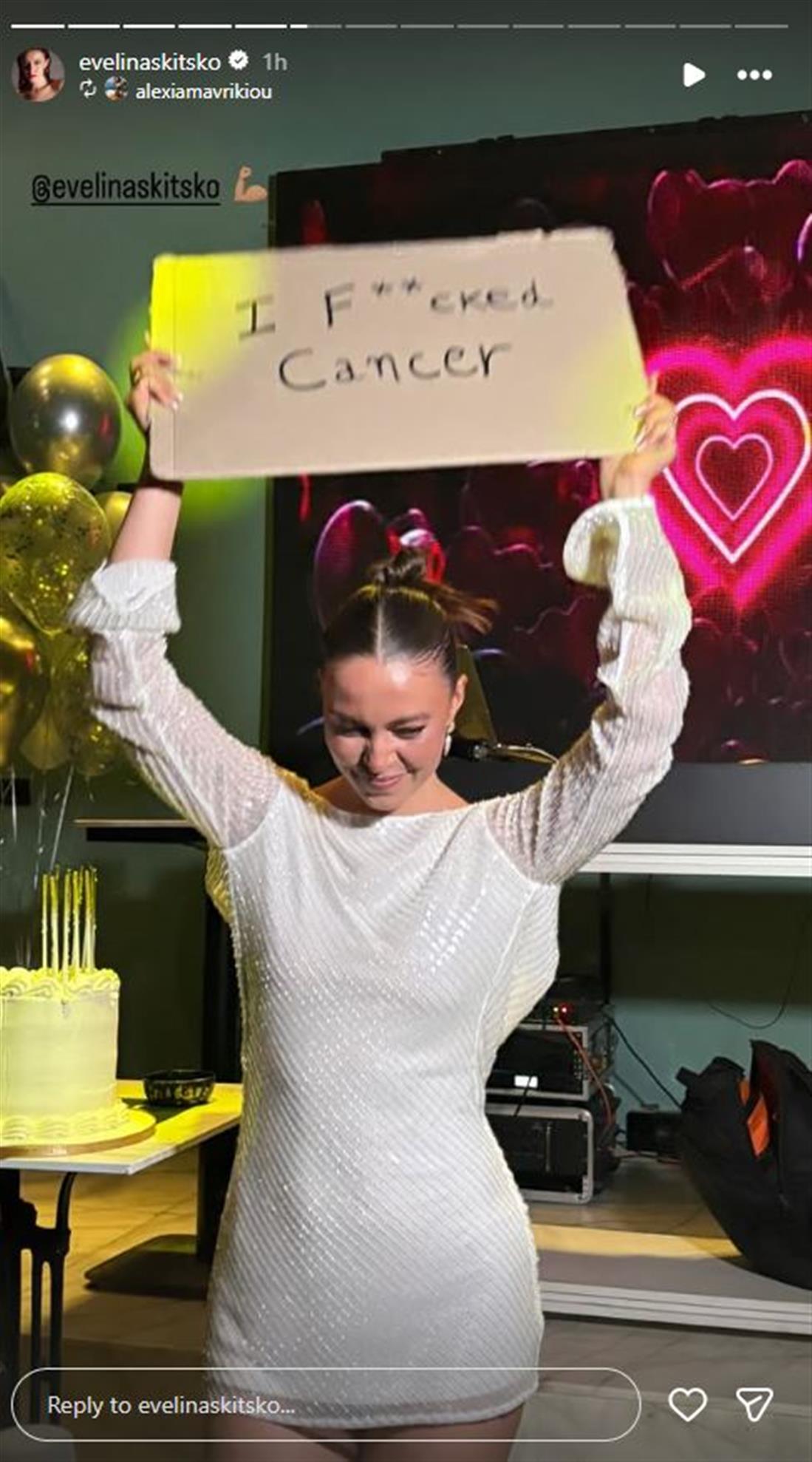 Όπως θα δείτε από τα στιγμιότυπα που μοιράστηκε στα social media η ίδια πόζαρε με ένα χαρτόνι το οποίο έγραφε «I F@@@@ cancer» λάμποντας από ευτυχία.
