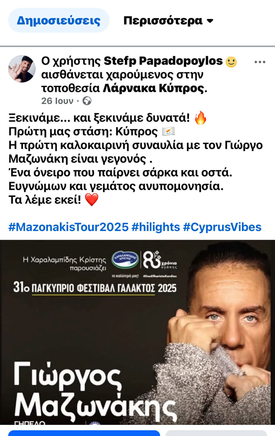 «Ξεκινάμε…και ξεκινάμε δυνατά! Πρώτα μας στάση: Κύπρος. Η πρώτη καλοκαιρινή συναυλία με τον Γιώργο Μαζωνάκη είναι γεγονός. Ένα όνειρο που παίρνει σάρκα και οστά. Ευγνώμων και γεμάτος ανυπομονησία. Τα λέμε εκεί!» έγραψε ο Στεφ σε ανάρτησή του στις 26 Ιουνίου.