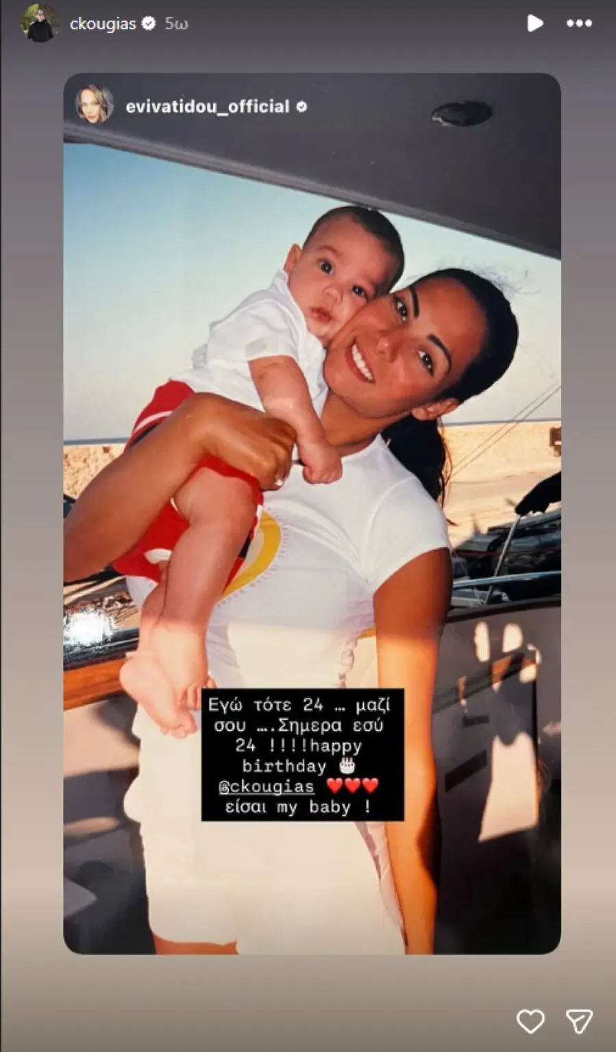 https://zouglablob.blob.core.windows.net/zougla-files/Uploads/2026/03/09/Kougias.mp4Νωρίτερα του ευχήθηκε και η μητέρα του, Εύη Βατίδου και δημόσια με μια ανάρτηση στο προφίλ της στο Instagram. «Εγώ τότε 24… μαζί σου… Σήμερα εσύ 24! Happy birthday. Είσαι my baby», έγραψε στην ανάρτησή της.